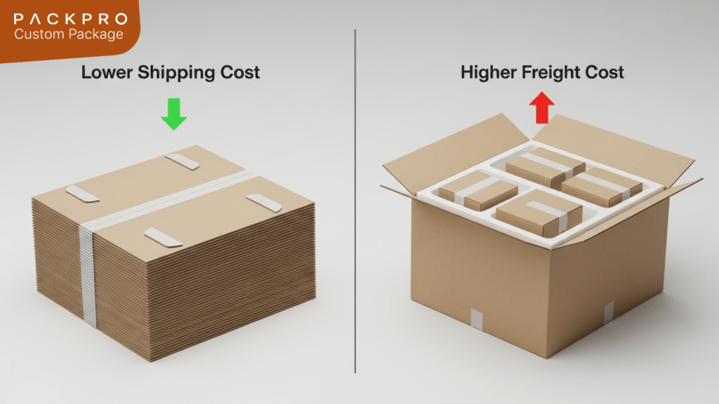 • Shipping Flat vs. Assembled: Folding cartons and unassembled corrugated boxes ship flat, taking up less space and costing less. Assembled rigid boxes are bulky and require more protective packing, which significantly increases freight costs.